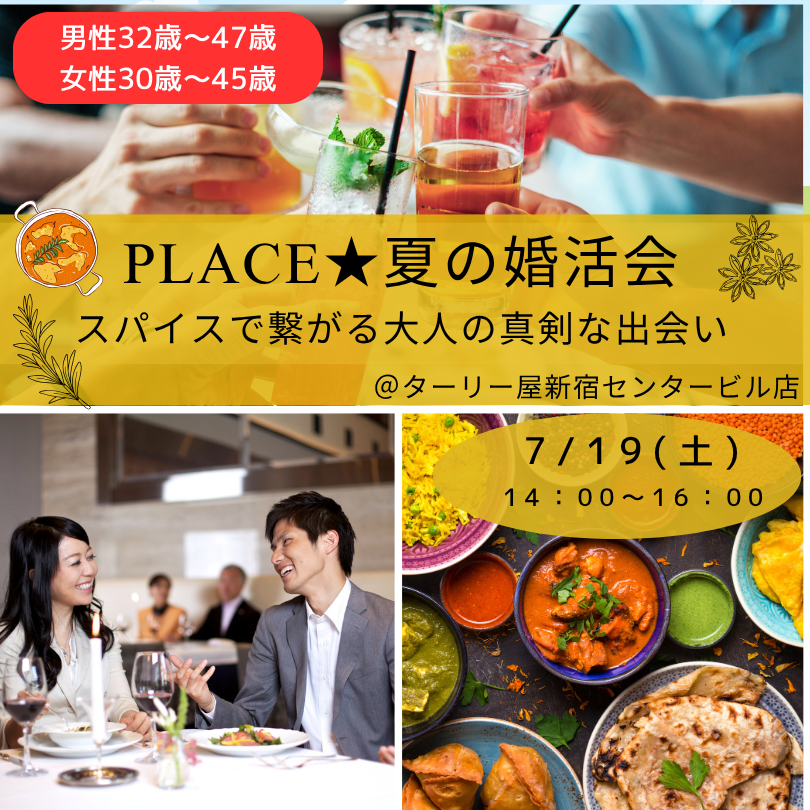 📅日程:7月19日(土)🕓時間:14:00~16:00📍場所:インド定食ターリー屋 新宿センタービル店👫対象:男性:32歳~47歳の真剣な出会いを求めている独身社会人